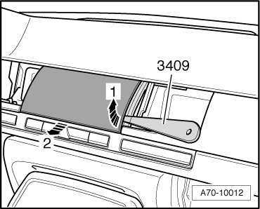 - Pry off panel at left and right on lower edge using trim removal wedge ( 3409) - arrow 1 -.