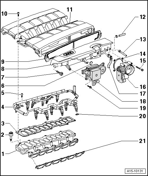• Left intake manifold side-section, removing and installing => [ Left Intake Manifold Side-Section ] Left Intake Manifold Side-Section