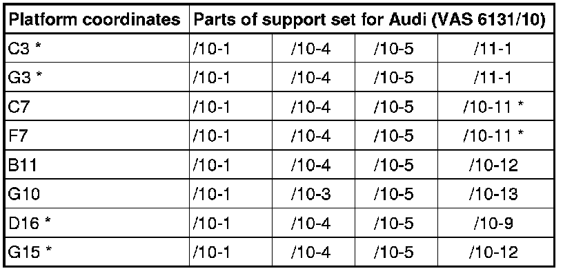 - Equip scissor lift platform (VAS 6131) with support set for Audi (VAS 6131/10) as follows: