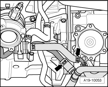 - Disconnect coolant hoses - arrows - from the left coolant pipes.