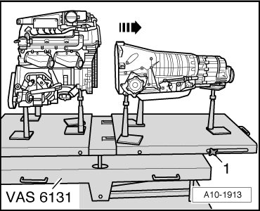 - Loosen side clamping screws - 1 - on scissor lift platform (VAS 6131) and pull rear platform top with transmission toward rear - arrow -, simultaneously push torque converter through opening of drive plate while doing this.