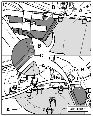 • When installing the evaporator cover, apply - B - a 3 x 3 mm, 65 mm long foam strip - C - into the left and right tongue and groove joint between the housing lower section - A - and the evaporator cover - B - or seal this area with adhesive sealant, for example , Silicone Adhesive Sealant (D 176 001 A3). .