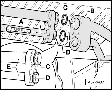 - Replace O-rings - C - and - D - between connecting pipe in A/C unit - B - and to evaporator - E -, version. .