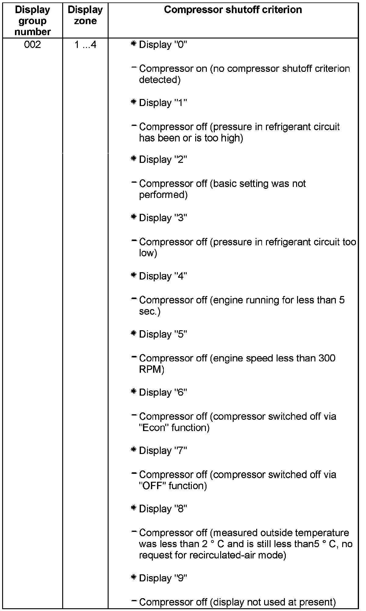 Explanatory notes for compressor shut-off conditions in display group "002"