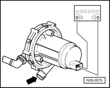 - Connect Secondary Air Injection Pump Motor with corresponding adapter lines to positive and negative battery terminals. Secondary Air Injection Pump Motor must run and air must escape at compressed-air connection - arrow -.