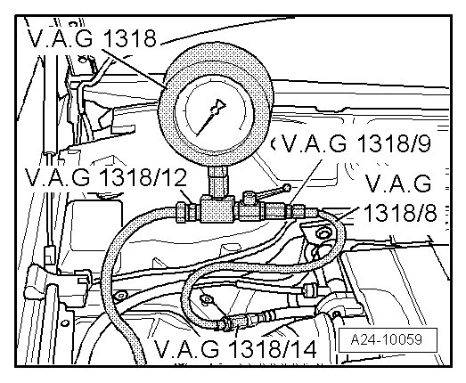 - Connect Fuel Inj. Pressure gauge (V.A.G 1318 ) to fuel supply line.