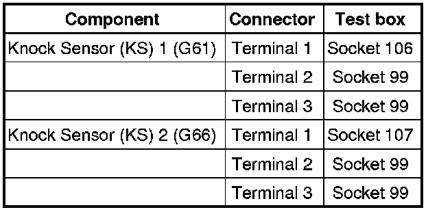 - Check resistance between terminals 1 + 2, 1 + 3 and 2 + 3 at the connections to the respective knock sensors. Specification: infinite ohms
