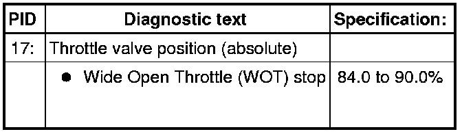 - Check specified value of throttle valve position (absolute) at Wide Open Throttle (WOT) stop: