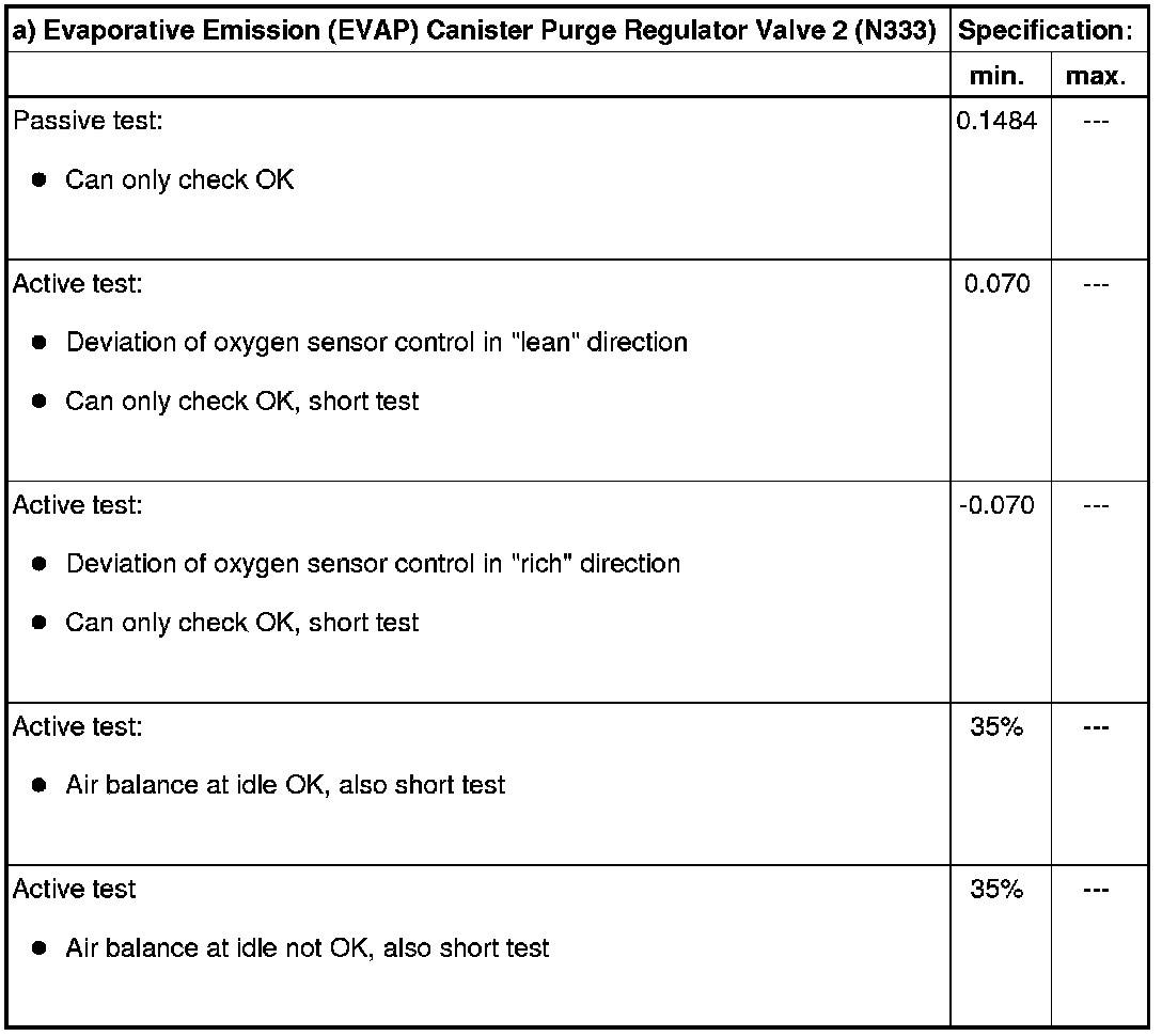- Evaporative Emission (EVAP) Canister Purge Regulator Valve 2 ( N333), checking => [ EVAP Canister Purge Regulator Valve 2, Checking ] Component Tests (VAG Code Tests).