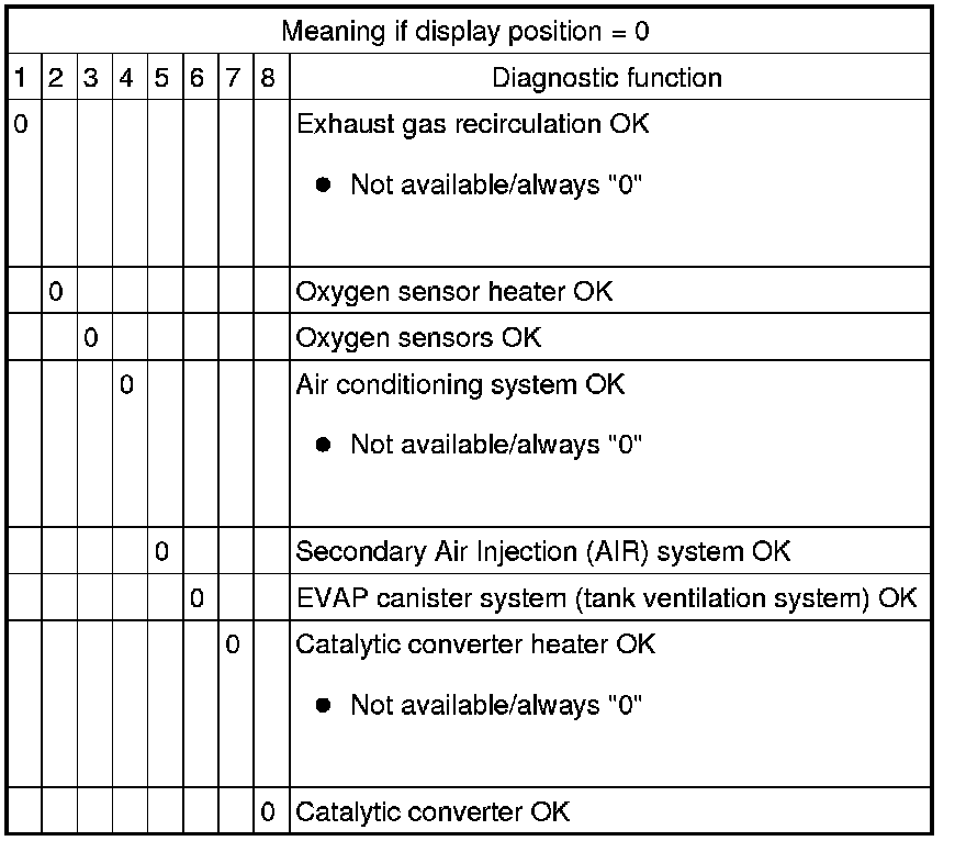 When the diagnostic for a system (e.g.: secondary air system) has run through successfully, the respective digit of the number block is set from 1 to 0.