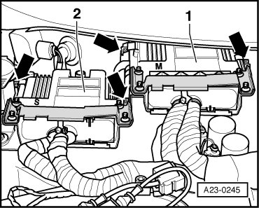 The threads of the shear bolts - 4 - (not screwed into the ECM) are coated with a locking compound. For this reason, the threads must be heated with the heat gun to remove both bolts.