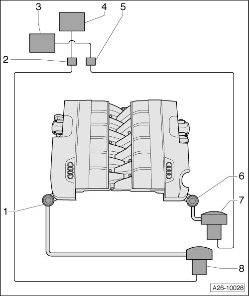 In the cold-run phase, control modules - 3 - and - 4 - activate the secondary air injection (AIR) pumps - 7 - and - 8 - via both secondary air injection (AIR) pump relays - 2 - and - 5 -. The stream of air from the secondary air injection (AIR) pump opens the combination valve and allows air to flow into the exhaust system before the catalytic converter.