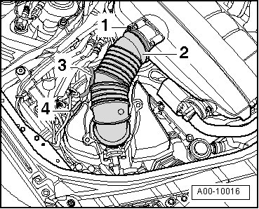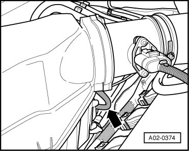- Make sure the air guide hose is seated securely between Mass Air Flow (MAF) sensor (G70) and Throttle Valve Control Module (J338).