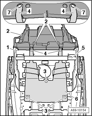 - If the straps - 4 - (Qty. 2) on mat for passenger occupant detection system - 6 - are routed beneath the transverse beam - 5 -, cut through the straps - 4 - (Qty. 2) as depicted in the illustration.