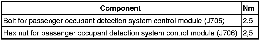 If it is not possible to pass passenger occupant detection system control module (J706) through the narrow opening, disconnect the connector on the control module - 5 - and remove the control module. Only perform this step if it pertains to the passenger occupant detection system as delivered from the factory. (In the original vehicle delivery state, passenger occupant detection systems cannot be removed without destroying them.)