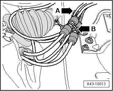 - Secure the line connector - 3 - to the wiring harness - arrow A - and - arrow B - with the cable tie - 4 -.