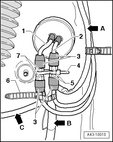 - Secure one or two of the line connectors - 5 - and - 7 - as needed on the wiring harnesses - arrow A -, - arrow B - and - arrow C - using a cable tie - 4 - as shown in the illustration.