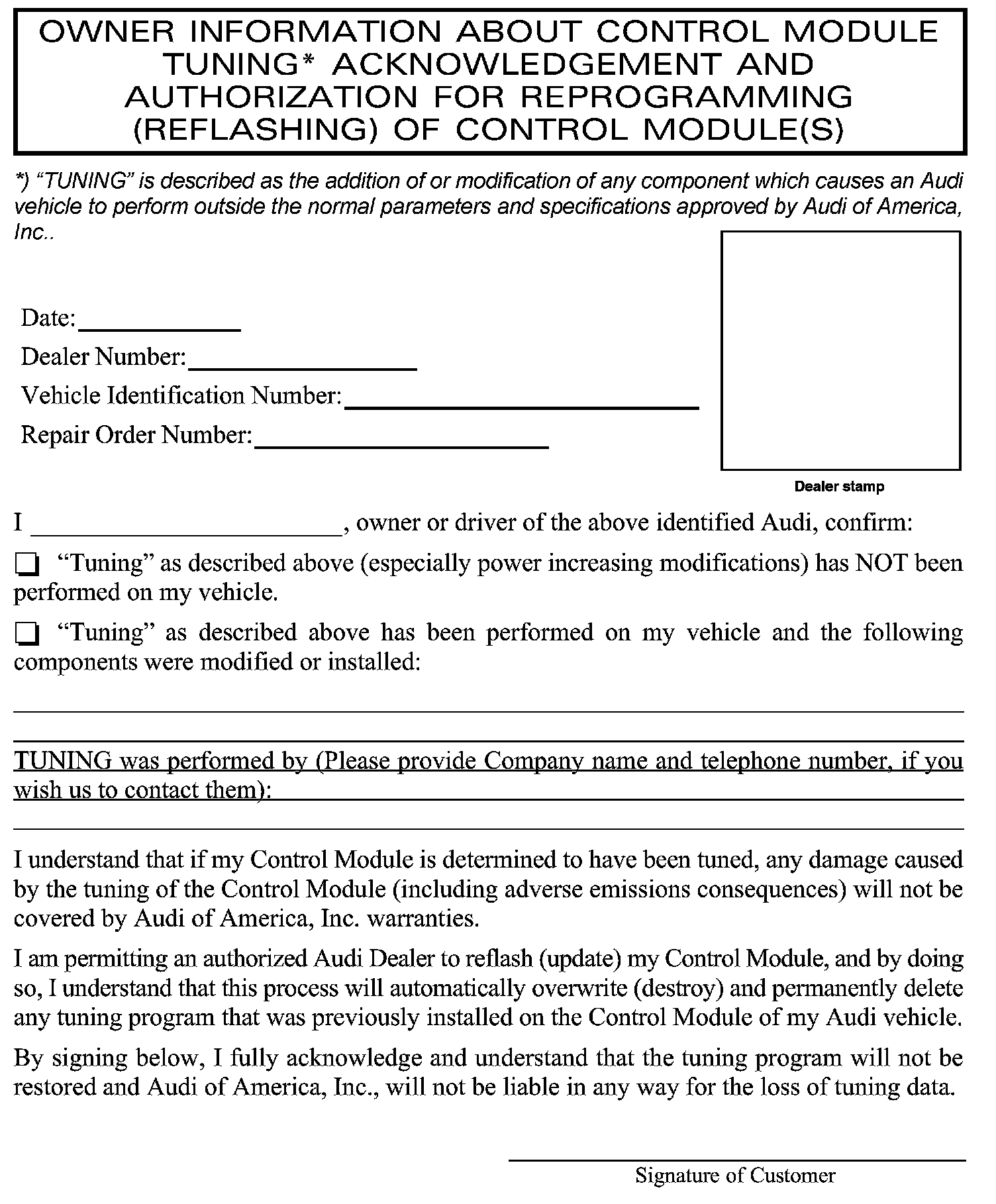 Any Update Programming procedure (flash) may overwrite any tuned ECM or TCM programming. A tuned ECM or TCM is described as any ECM or TCM altered so as to perform outside the normal parameters and specifications approved by Audi of America, Inc.