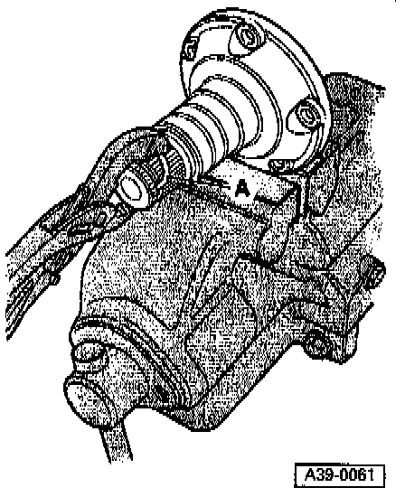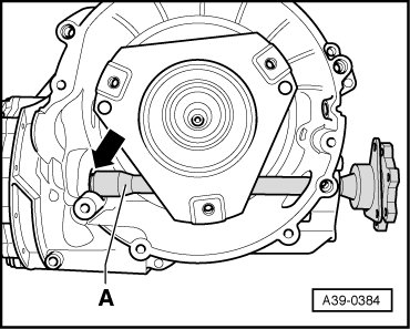- Insert flange shaft - A - into transmission and guide shaft into shaft seal on front final drive - arrow -, keeping shaft centered.
