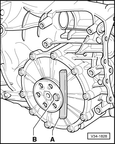 - Remove flange shaft by placing a chisel or spacer piece - A - under flange shaft and by turning bolt - B -.