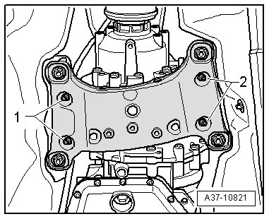 - Insert a bolt M12x100 - 1 - with attached nut - 2 - in mount behind transmission oil pan.