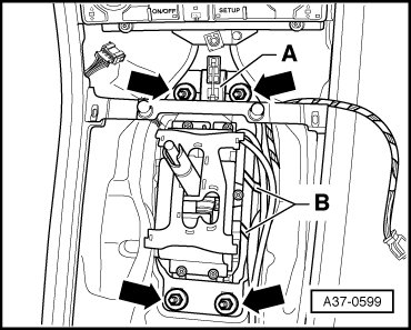 - At the same time, guide out actuator mechanism for manual release - A - and selector lever cable - B - from cover.
