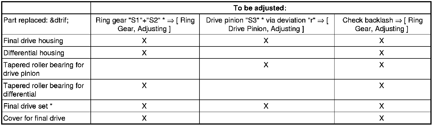 • If repairs have been performed on the final drive it is only necessary to adjust the drive pinion or final drive set if components have been replaced which have a direct effect on the adjustments of the final drive. Refer to the following table to avoid unnecessary adjustments: