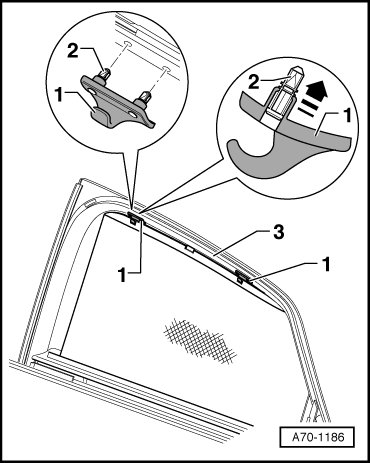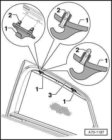 - Position pins - 2 - of securing hook - 1 - to holes in door frame - 3 -.
