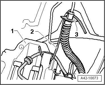 - Remove left and right brake caliper - 1 - and tie it with an wire - 2 - at brake line bracket - 3 -.