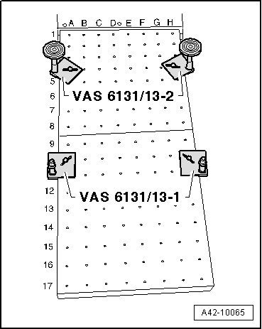 - Attach both Supports (VAS 6131/13-1) and (VAS 6131/13-2) from Basic Set (VAS 6131/13) on Scissor Lift Table (VAS 6131).