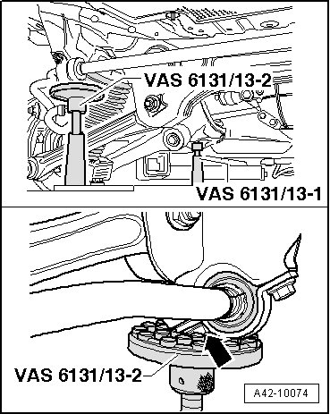 - Support rear of the subframe so that front screw from stabilizer bar bracket is located in center of mount (VAS 6131/13-2) - arrow -.
