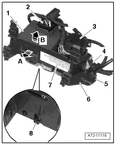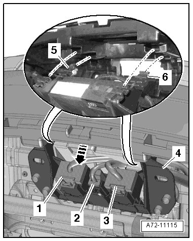 - Disengage the hooks - 5 and 6 - and remove the bracket - 4 - for the connectors from the trim bracket - arrow -,