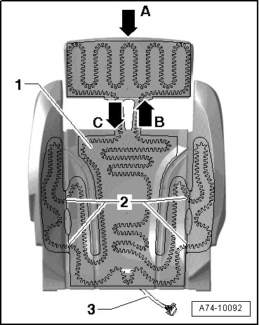 Ensure heating element is completely bonded at front of seat height adjuster padding - arrow A - and inner sides - arrow B - and - arrow C -.