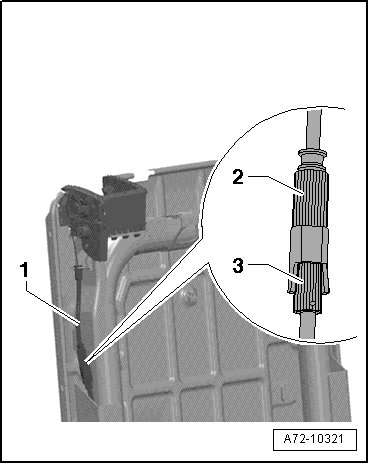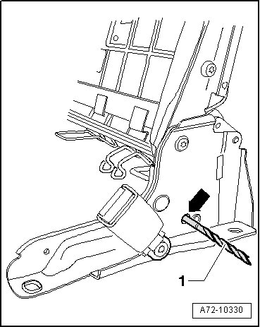 - With backrest release handle, refer to => [ Handle ] Handle and trim, refer to => [ Trim ] Trim installed, ensure a 7 mm drill bit or drift - 1 - can be inserted in hole - arrow - and handle has noticeable play without releasing backrest.