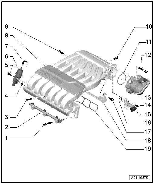 • Tightening specification => [ Fuel Rail and Injectors, Assembly Overview ] Fuel Rail and Injectors, Assembly Overview.
