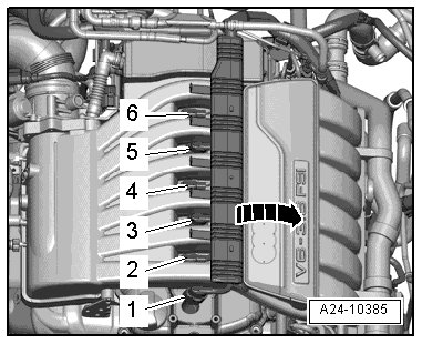 - Unclip cover strip for ignition coil - 1 to 6 - ignition wiring harness - arrow -.