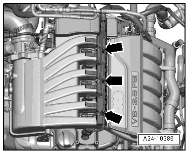 - Release electrical connectors on ignition coils with assembly tool (T10118) - arrow - and remove.