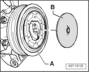 - Clean drive plate of belt pulley - A - and glue plastic disc - B - centered onto drive plate (only on A/C compressors with 3 holes in the drive plate and without rubber disc on the circlip).