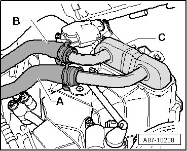 - Connect coolant hose - B - to coolant pipe to heater core - C - (coolant hose - A - is not connected for the time being).