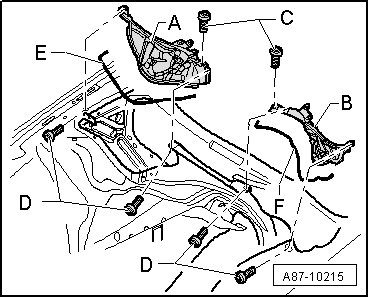 • Right section of plenum chamber front wall - A - is secured to vehicle by bolts - C - and - D -. A seal - E - is installed between plenum chamber front wall and vehicle body.