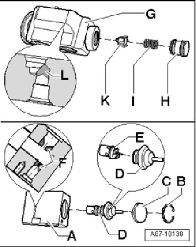 - Expansion valves are available in different versions and designs. For version - A -, there must be removed components - B -, - C - and - D -. Then remove component part - E - (regulating element) from component - D -. Drill expansion valve in area - F - using suitable drill.