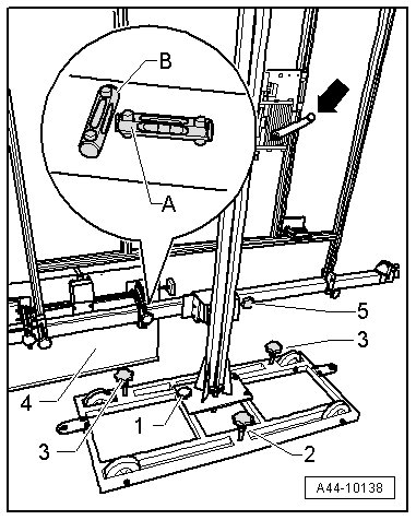 - Level the bubble levels - A and B - on the (VAS 6430) using the adjusting screws - 1, 2 and 3 -.