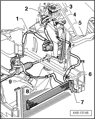 - Secure suction line - 1 - on coolant pipe - 3 -. Tighten nut - 2 - to 9 Nm.