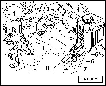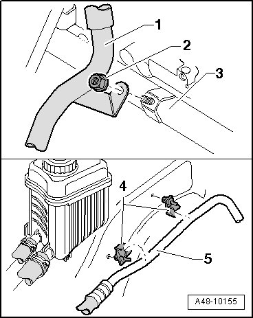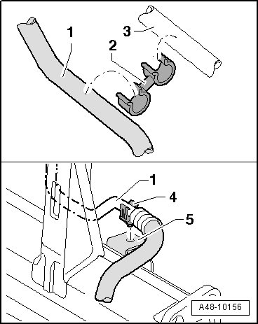 - Secure return line - 3 - with bracket - 5 - to coolant hoses - 4 -.