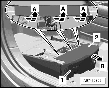 - Then remove cover in - direction of arrow B - from passenger's seat console.