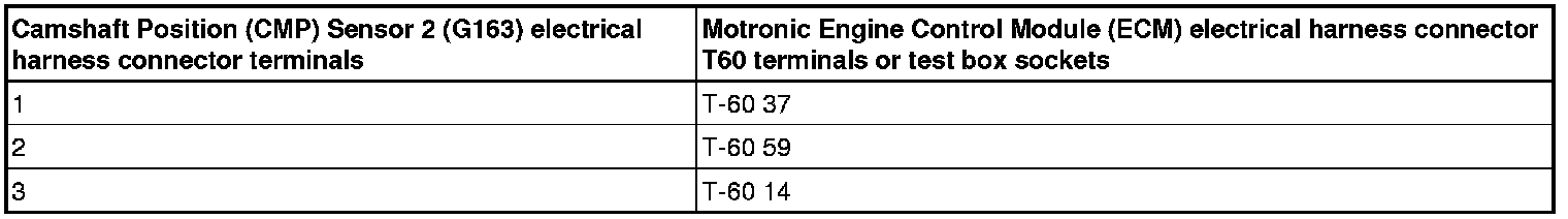 - Using a Multimeter, Check the Camshaft Position (CMP) Sensor 2 (G163) electrical harness connector to the Motronic Engine Control Module (ECM) electrical harness connector T60 for an open circuit.
