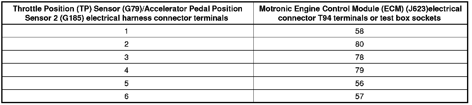- Using a multimeter, check the Throttle Position (TP) Sensor (G79)/Accelerator Pedal Position Sensor 2 (G185) electrical harness connector terminals to the Motronic Engine Control Module (ECM) (J623) electrical connector T94 for an open circuit.