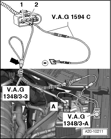 - Connect (V.A.G 1348/3A) with (V.A.G 1348/3-3) to terminal - 1 - on the connector.