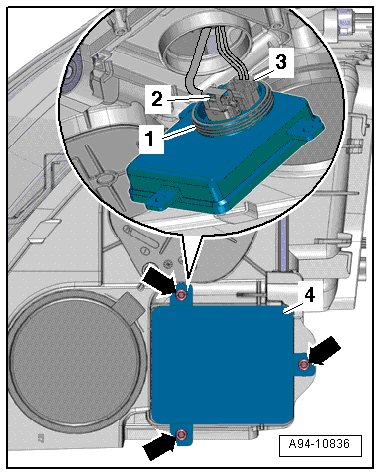 - Remove the screws - arrows - and remove the ballast - 4 - from headlamp housing.