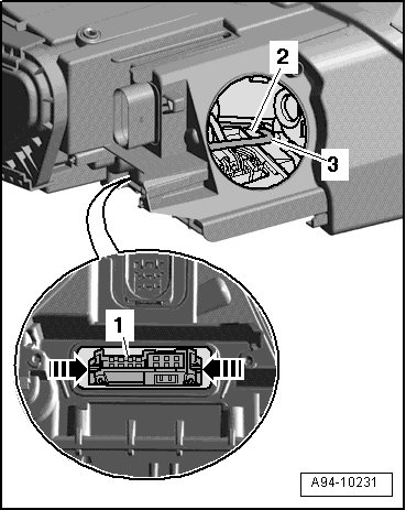 - Release both retaining springs - arrows - and slide connector - 1 - into headlamp housing.